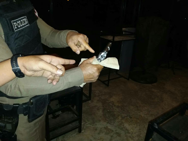 บริเวณถนนด้านหน้าร้าน พบรถยนต์เก๋ง ยี่ห้อเบนซ์ รุ่น E250 สีขาว ไม่ติดแผ่นป้ายทะเบียน กระจกด้านหน้าและหลังถูกทุบร้าวทั้งบาน และยังมีกระจกมองข้างด้านขวาถูกทุบจนหัก ข้างรถพบขวดเหล้าวางอยู่ 3 ขวด ส่วนเจ้าของรถคือ นายอรรถกร จังเกษม หุ้นส่วนร้านดังกล่าว แจ้งว่าผู้ก่อเหตเป็นขาย 2 คน ยังคงอยู่ในร้าน โดยมีอาวุธปืนไม่ทราบขนาดในตัวด้วย