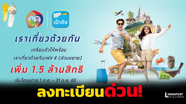 วันที่ 27 มิ.ย.65 โครงการเราเที่ยวกันเฟส 4 ส่วนขยาย เริ่มปิดให้ลงทะเบียนเป็นวันแรก สำหรับผู้ยังไม่เคยลงทะเบียนจำนวน 1.5 ล้านสิทธิ์ ส่วนประชาชนที่เคยลงทะเบียนโครงการเราเที่ยวกันเฟส 1 -4 แล้ว ให้กดรับหลักเกณฑ์และเงื่อนไข บนแอปฯเป๋าตัง ไม่ต้องลงทะเบียนรับสิทธิใหม่ สามารถใช้สิทธิที่คงเหลือต่อได้