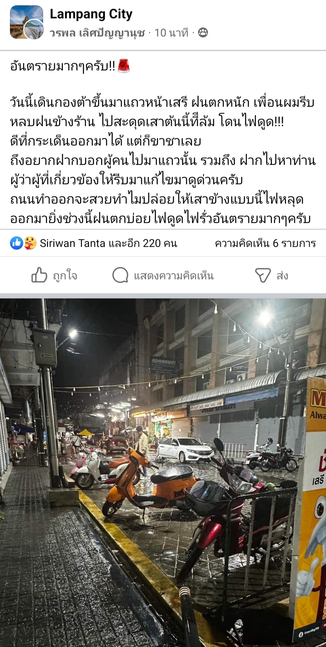 ผู้ใช้เฟซบุ๊กรายหนึ่ง โพสต์เตือนภัยในกลุ่มลำปางซิตี้ หลังเดินสะดุดเสาไฟที่ล้มอยู่ ซึ่งขณะนั้นได้เกิดฝนตกพื้นถนนและเสาเปียก ทำให้ถูกไฟดูด