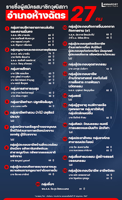 นายทองเนตร ดูใจ ผอ.กกต.ลำปาง เปิดเผยถึงการรับสมัครผู้ลงเลือกตั้งสมาชิกวุฒิสภา จ.ลำปาง ว่า พื้นที่ของ จ.ลำปาง มี 13 อำเภอ มีผู้สมัครทั้งหมด 20 กลุ่ม 462 คน อำเภอเมืองลำปาง 129 คน อำเภอเกาะคา 69 คนอำเภอแม่เมาะ 56 คน อำเภองาว 50คน อำเภอแม่ทะ 28คน อำเภอห้างฉัตร 27 คน อำเภอเถิน 22 คน อำเภอวังเหนือ 19 คน อำเภอแม่พริก 19คน อำเภอเสริมงาม 13 คน อำเภอแจ้ห่ม 13 คน อำเภอเมืองปาน 11 คน อำเภอสบปราบ 6 คน
